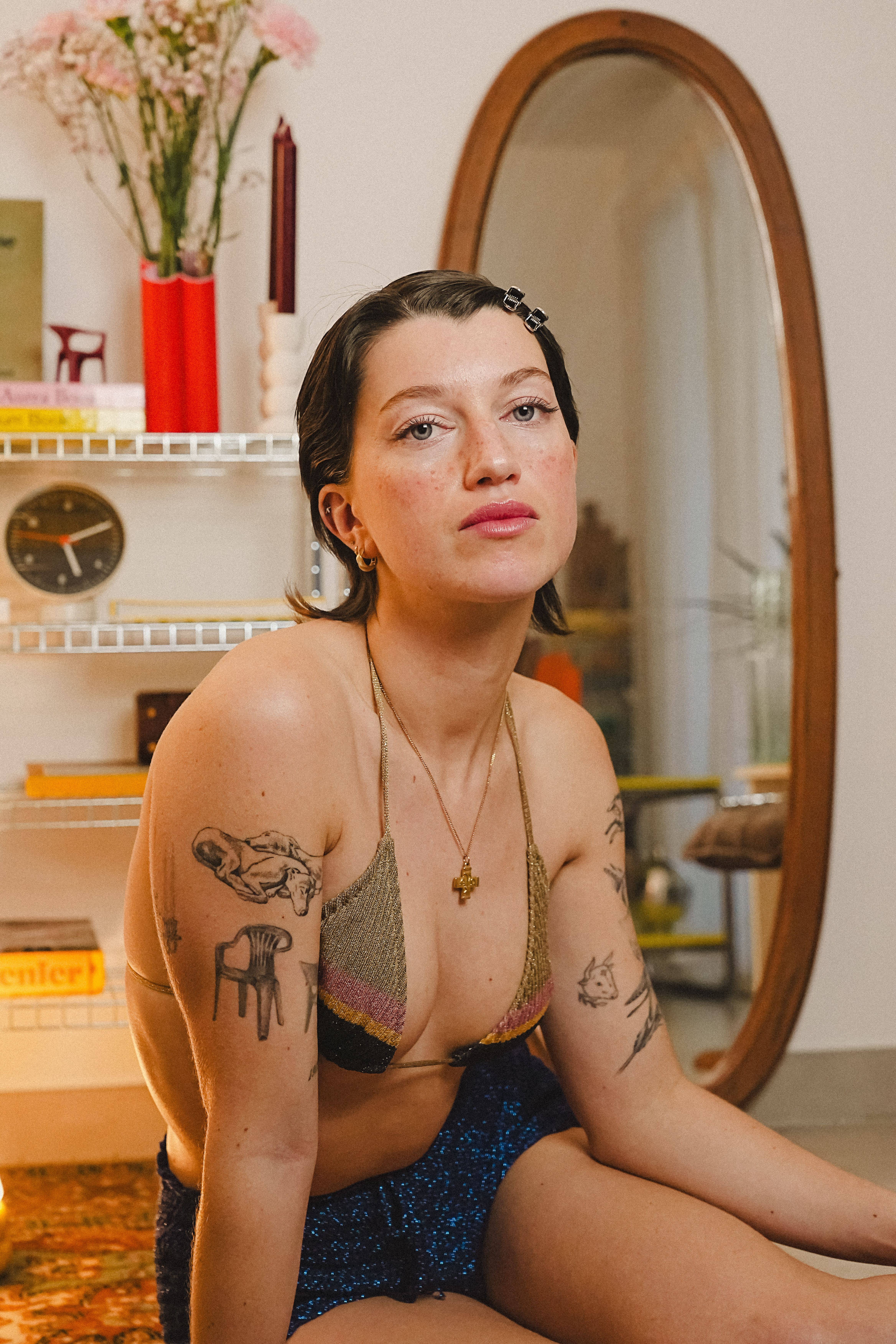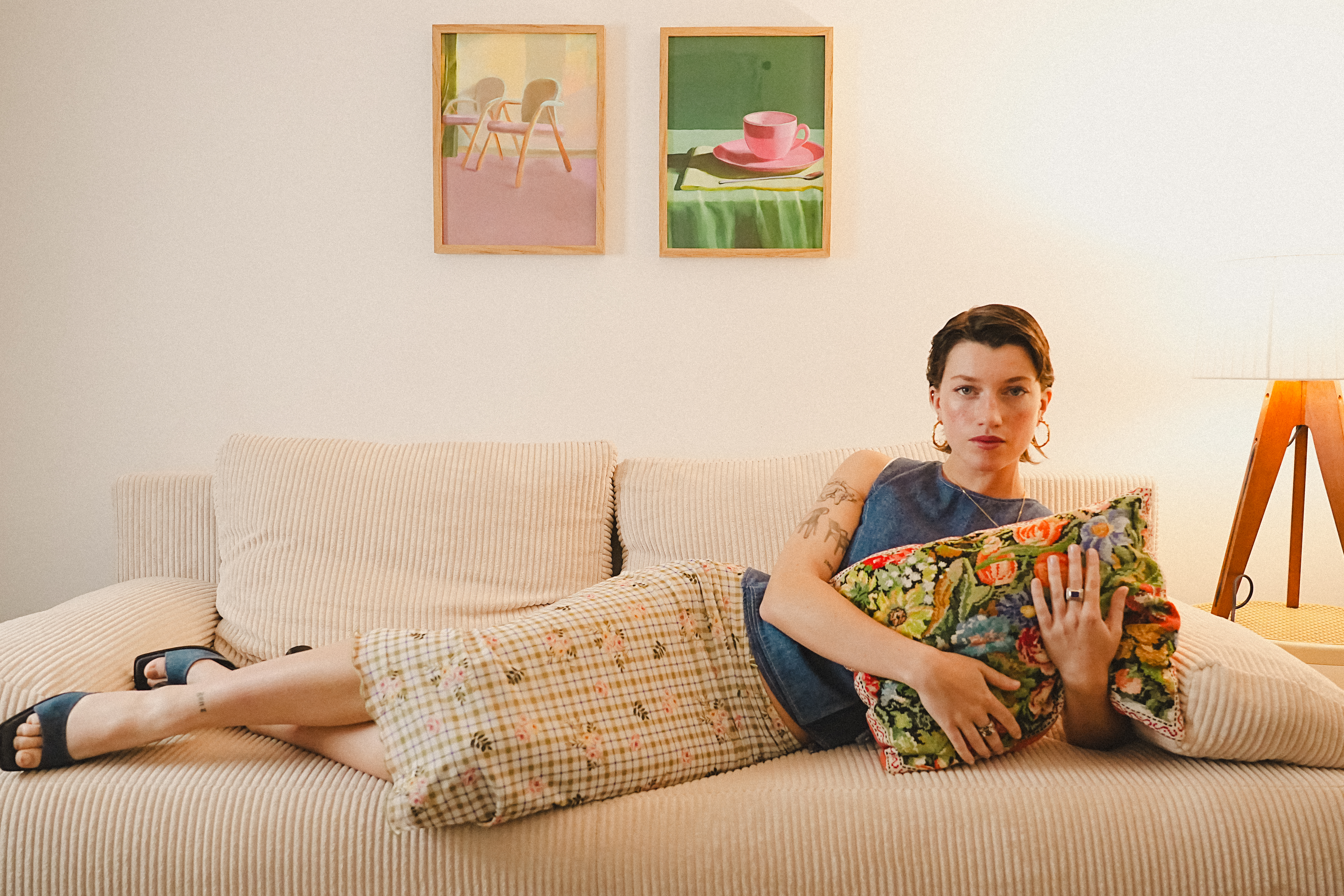 Dans un salon au charme rétro et mobilier d’époque, l’élégance se réinvente. Assis sur son canapé, le modèle captive d’un simple regard, intense et énigmatique.