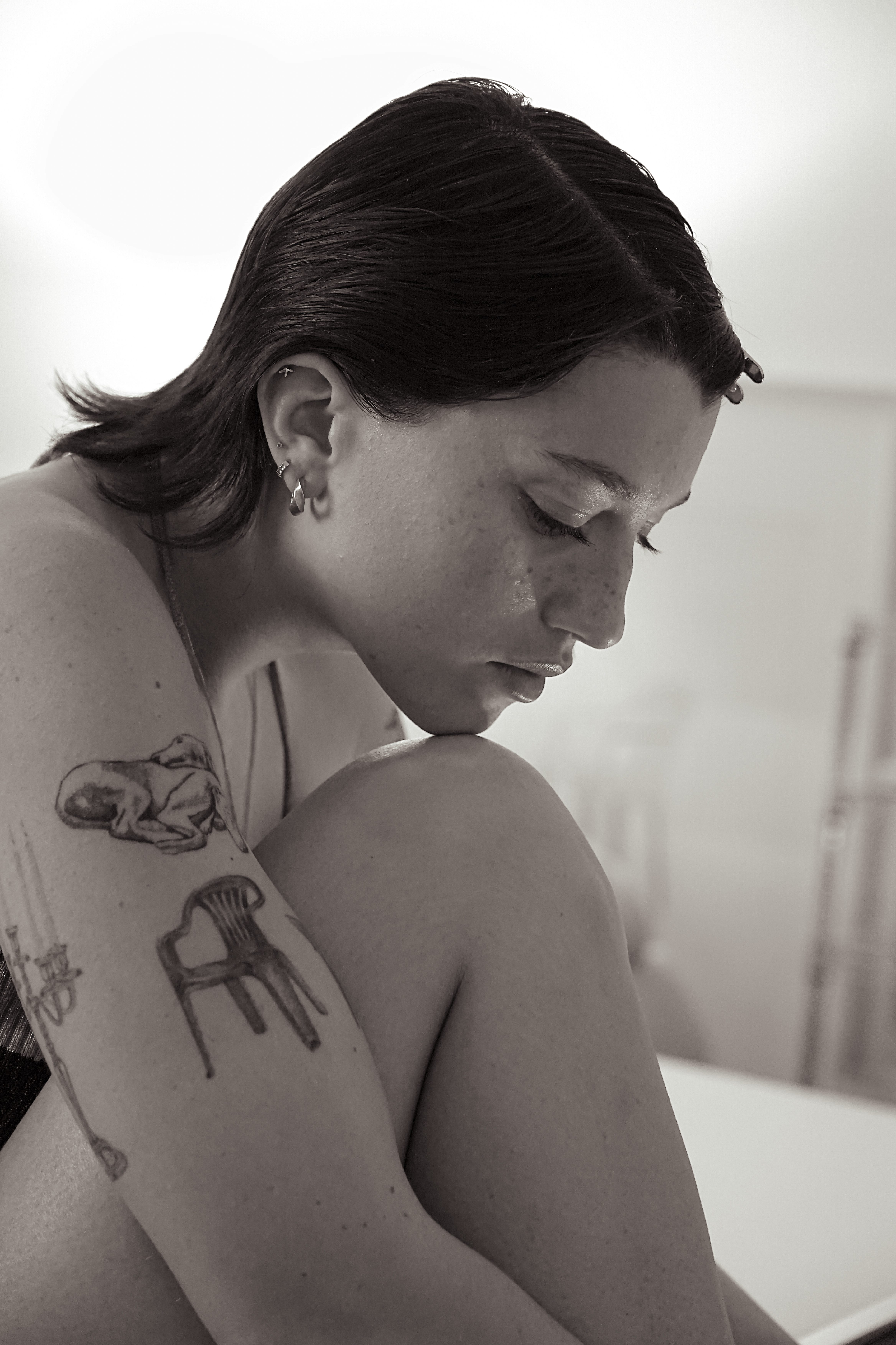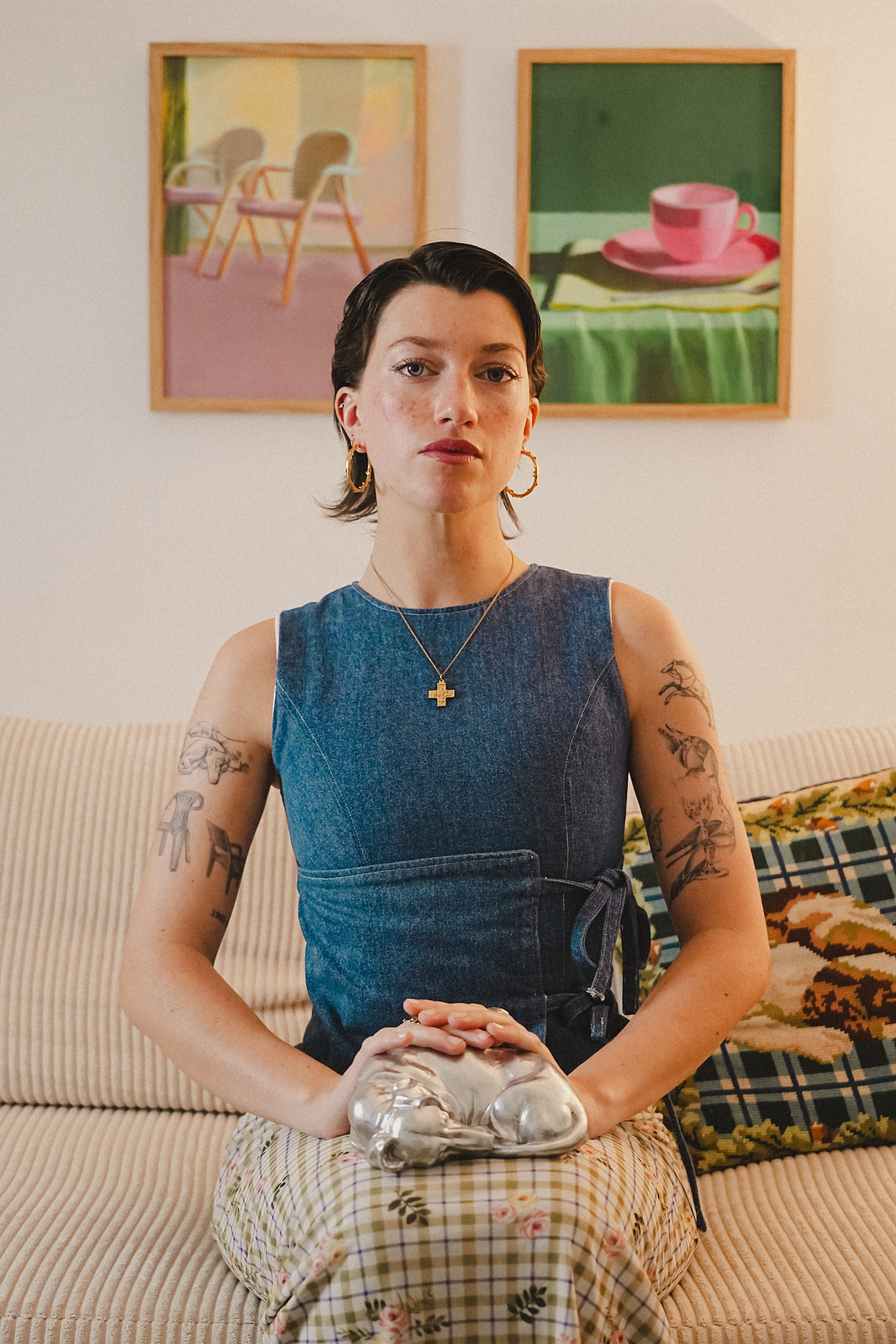 Un chien en argent se repose sur ses genoux. Cet objet précieux semble presque vivant, un compagnon silencieux.
